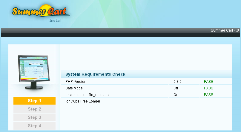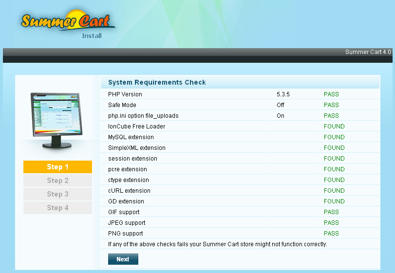 Ioncube и cUrl are installed. Now we can continue with the installation of Summer Cart at address - localhost/sc/ If everything is installed correctly you will see the following screen: