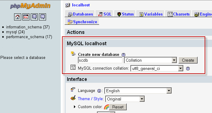 - Now you have username and password but you also need database where all data will be gathered. Open again - http://localhost/phpmyadmin/ Find Create new database, enter name of the database(we created database with name scdb) and click on Create button to create the new database.
