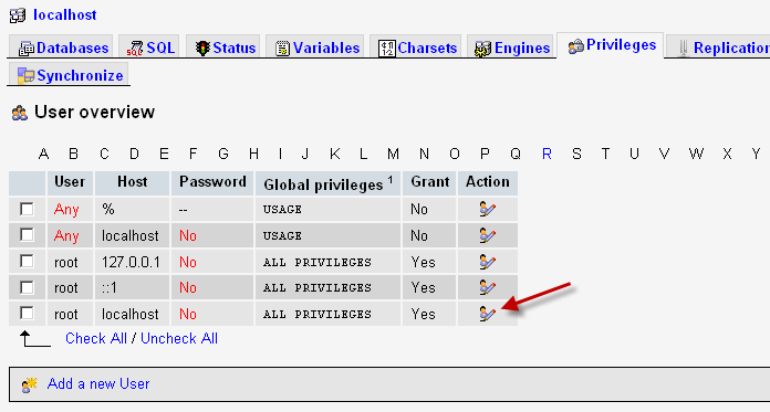 root. Open address - http://localhost/phpmyadmin/ and click on tab - Privileges Click on icon