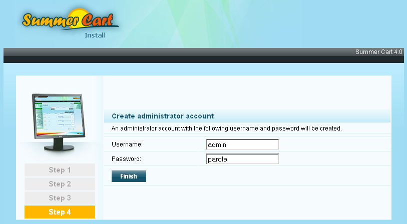 Enter username and password which you will use for logging in to the administration panel of Summer Cart and click on Finish to finish the installation.