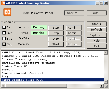 Summer Cart requires Аpache, PHP и MySQL to be installed on the computer where you will do the installation. The easiest way to install this requirements is to get a package which includes three of them. In this article we will use XAMPP. You can download it from here for free. Installation process is quite easy and we won't describe it in this article. We will install our XAMPP in folder C:\xampp\ This is the default installation folder and if you don't change anything settings during the installation, your Wamp will be installed in the same folder. After the installation, start XAMPP. New window will appear(screen below). Click on Start button next to Apache and MySQL to start them. If everything is OK you will see Running next to Apache and MySQL.
