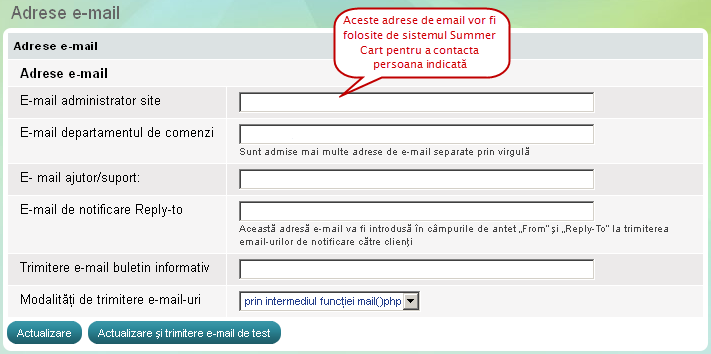 În pagina 'Emailuri' puteţi introduce adresele de email pe care sistemul Summer Cart le va folosi pentru a contacta Administratorul paginii web, Departamentul Comenzi şi echipa de Suport.