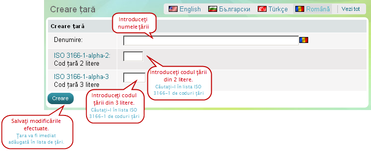 - Click pe butonul 'Ţată nouă' din antetul paginii. Se va deschide pagina 'Creare ţară'.