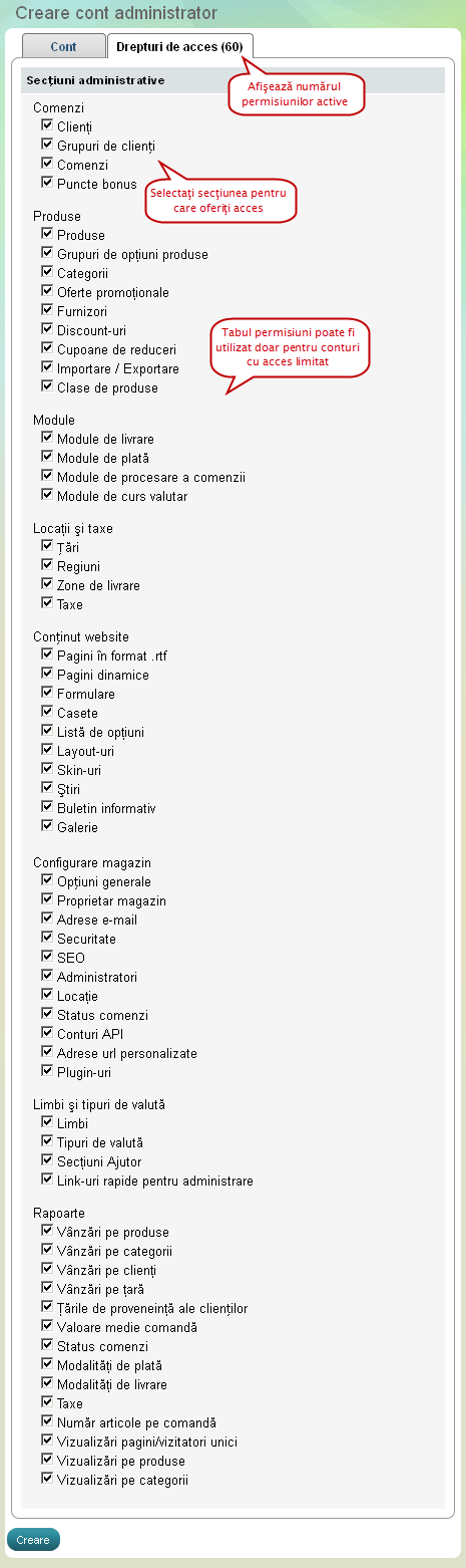 Tabul 'Permisiuni' în pagina 'Creare administrator'