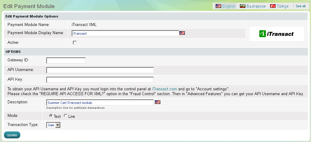 Summer Cart store owner is required to enter his or her Gateway ID provided by iTransact |