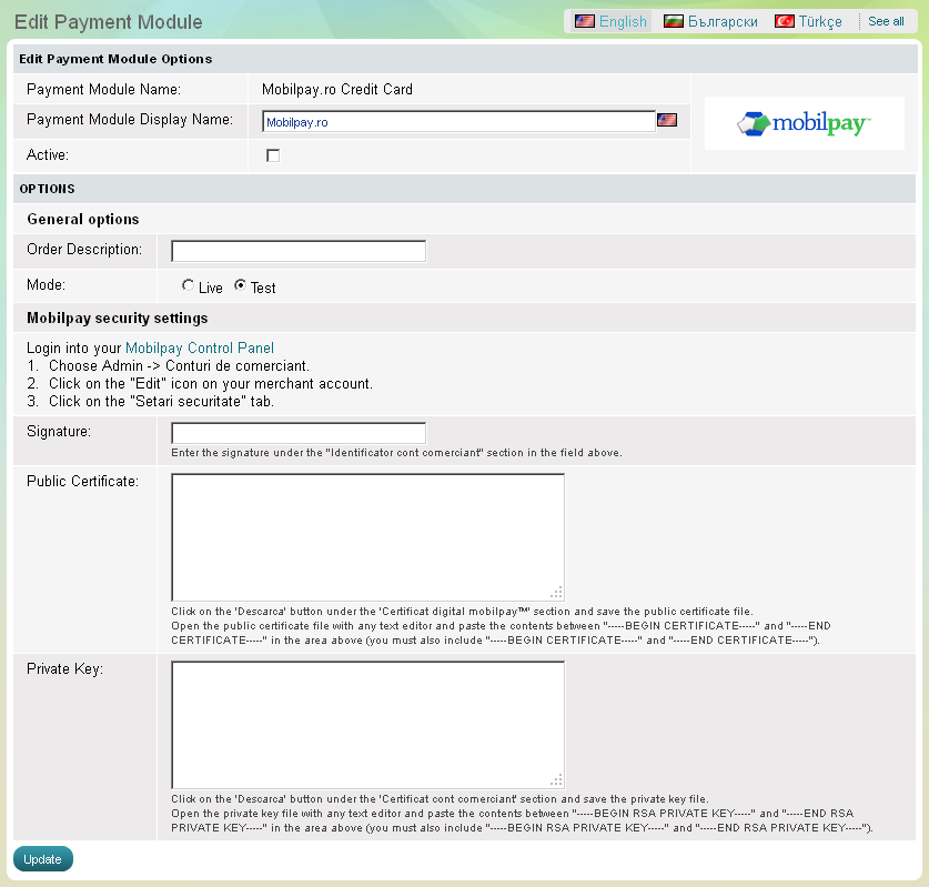 The Mobilpay.ro module has 5 setup options that need to be completed before its activation: