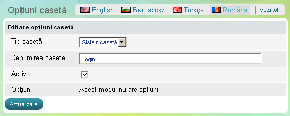 Folosiţi secţiunea 'Autentificare' pentru a permite vizitatorilor să se înregistreze şi să se autentifice în magazin. După ce se autentifică, acestia pot deasemenea să se deautentifice. Secţiunea are un singur parametru - să fie activă, ceea ce înseamnă că este vizibilă în pagina web sau, din contră - inactivă, caz în care întreaga secţiune va dispărea pentru vizitatori.