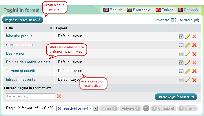 'Pagini cu text formatat' vă permite să creaţi pagini noi, să personalizaţi conţinutul celor deja existente şi să ştergeţi paginile neadecvate din magazinul dvs.