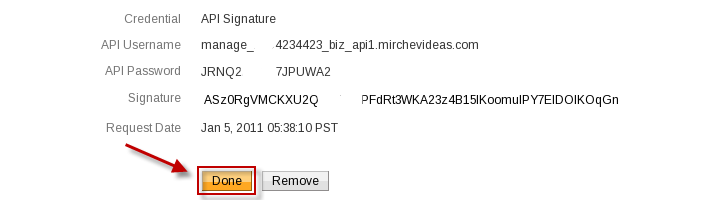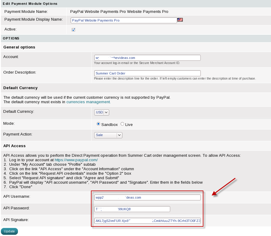 - PayPal will display "API account username", "API Password" and "Signature". Enter them in the corresponding fields in the module's options (see point 10)