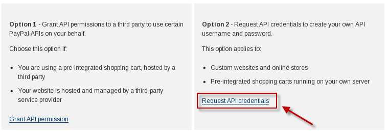 - Click on the link "Request API credentials" inside the "Option 2" box