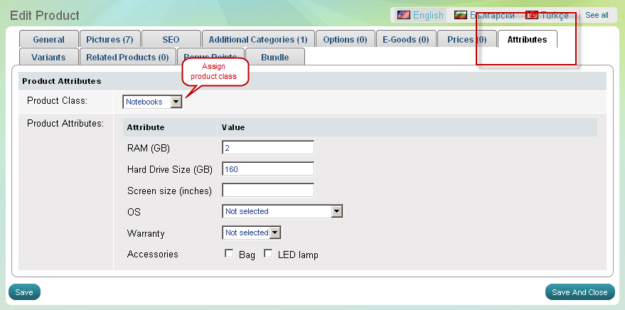 Use 'Product classes' page to create a new product class (e.g. Notebooks) and define the belonging attributes (e.g. operating system, weight, CPU speed, display size, etc). You can also edit or delete a product class, as well as add, edit and delete specific product attributes. You can use 5 types of attributes